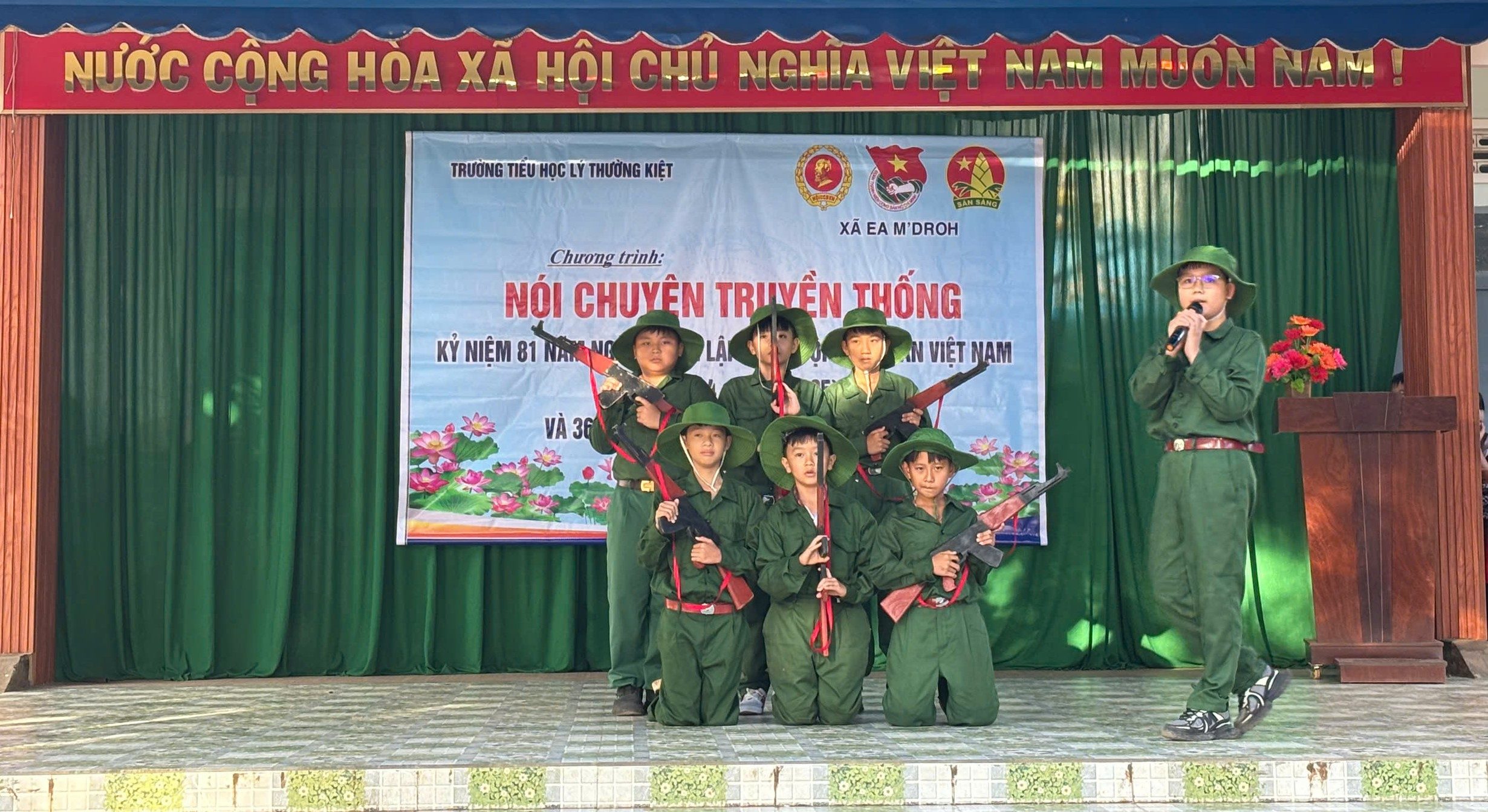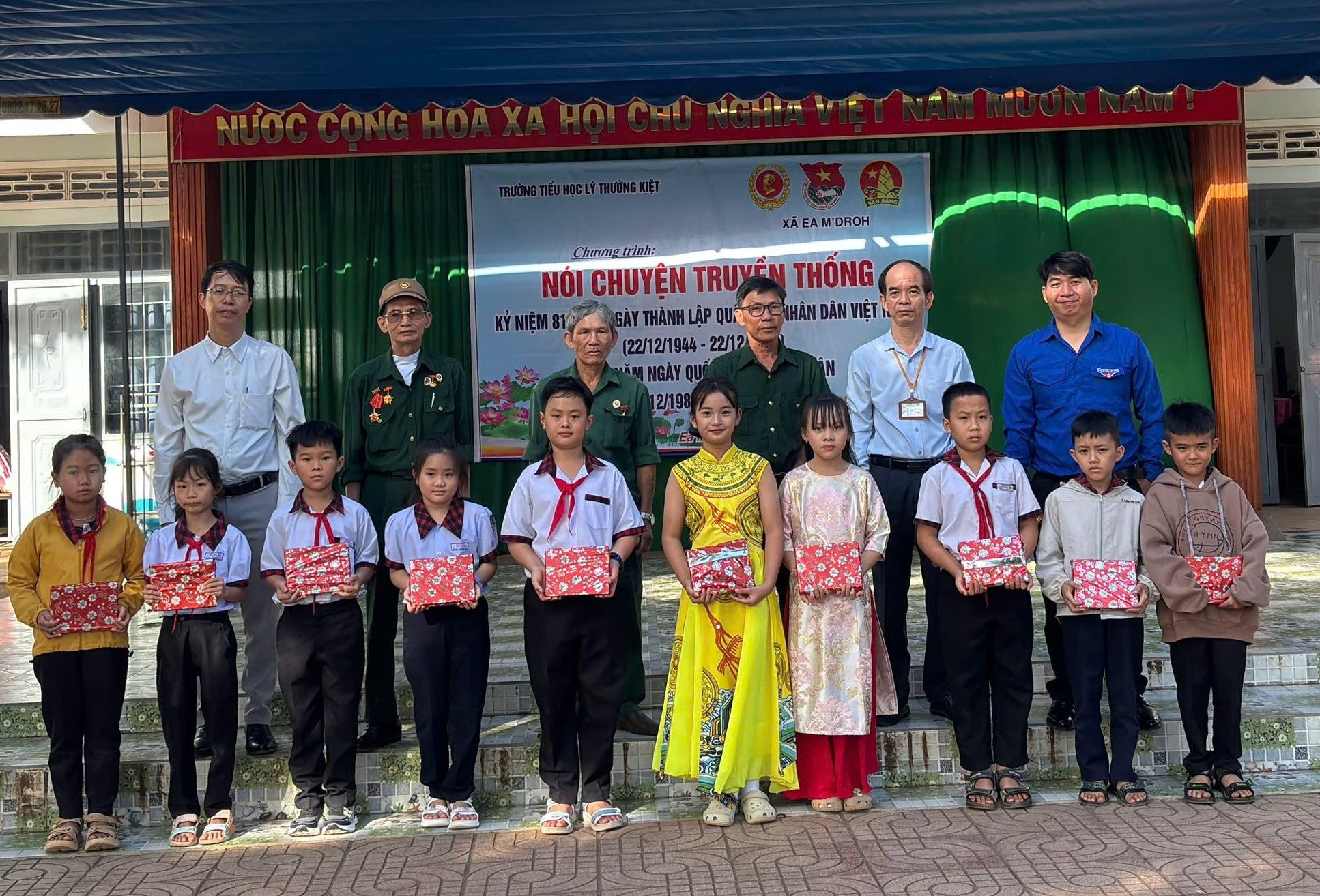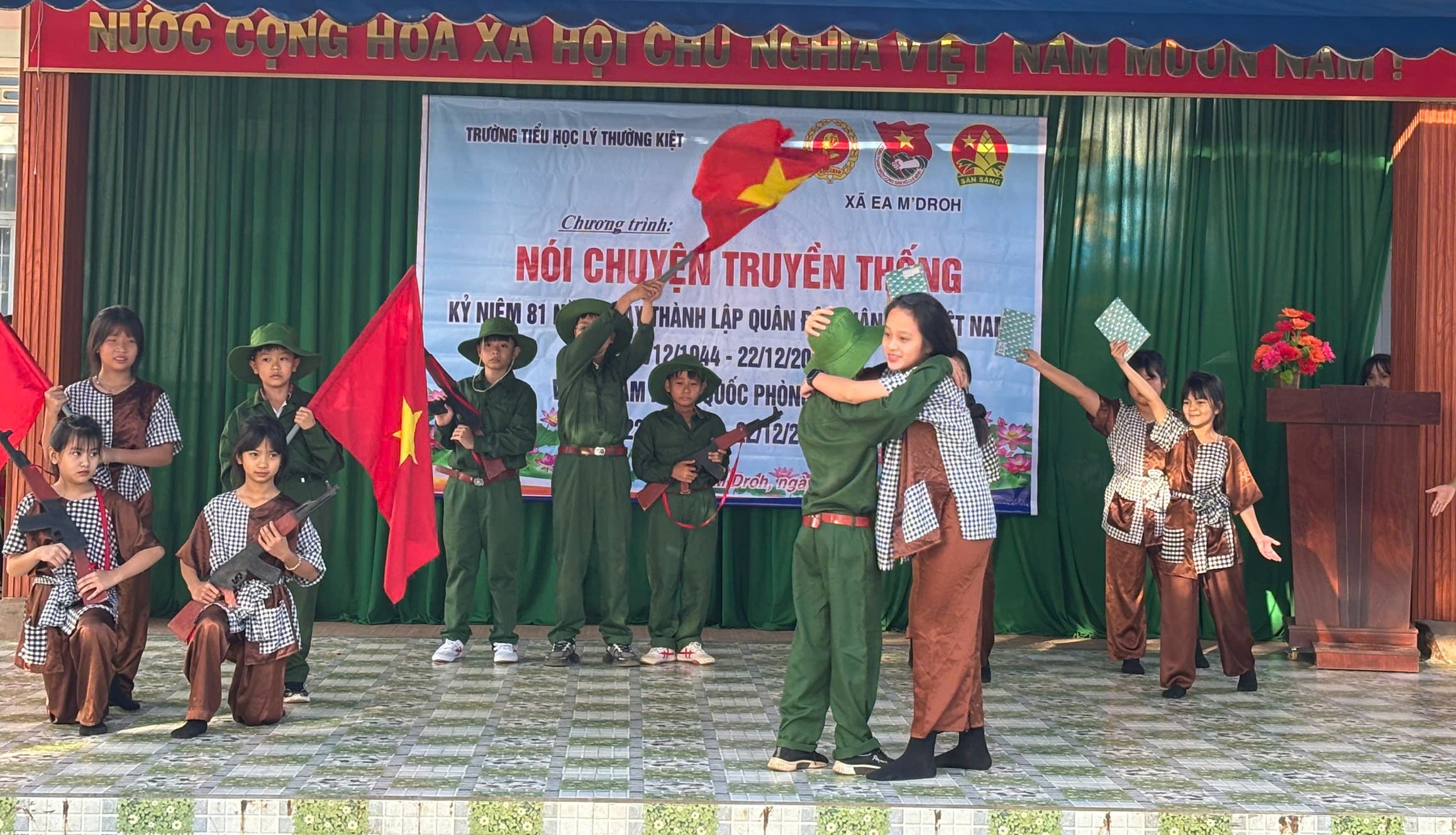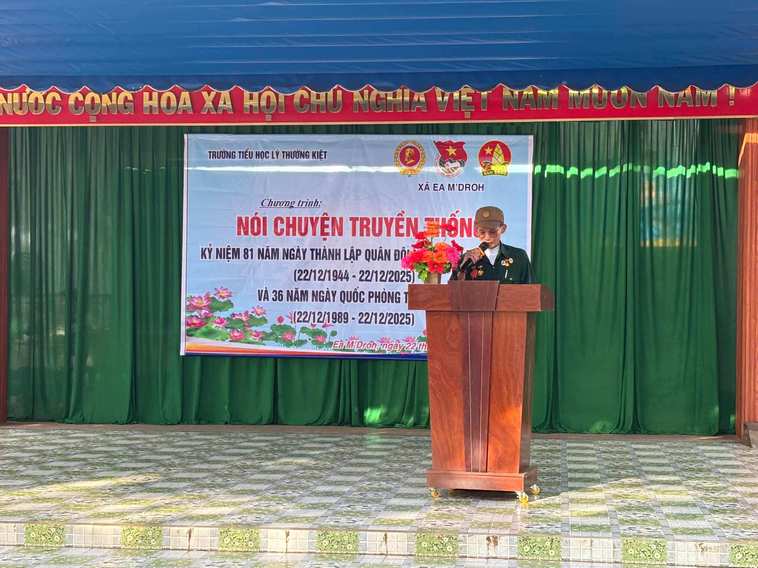 Thực hiện Kế hoạch số 01/KHPH-CCB-ĐTN ngày 04/12/2025 của Hội Cựu chiến binh – Đoàn Thanh niên xã Ea M’Droh, thiết thực chào mừng 81 năm Ngày thành lập Quân đội nhân dân Việt Nam (22/12/1944 – 22/12/2025) và 36 năm Ngày Hội Quốc phòng toàn dân (22/12/1989 – 22/12/2025), sáng ngày 22/12/2025, Trường Tiểu học Lý Thường Kiệt đã phối hợp với Hội Cựu chiến binh và Đoàn Thanh niên xã Ea M’Droh tổ chức Chương trình nói chuyện truyền thống cho cán bộ, giáo viên và học sinh toàn trường.