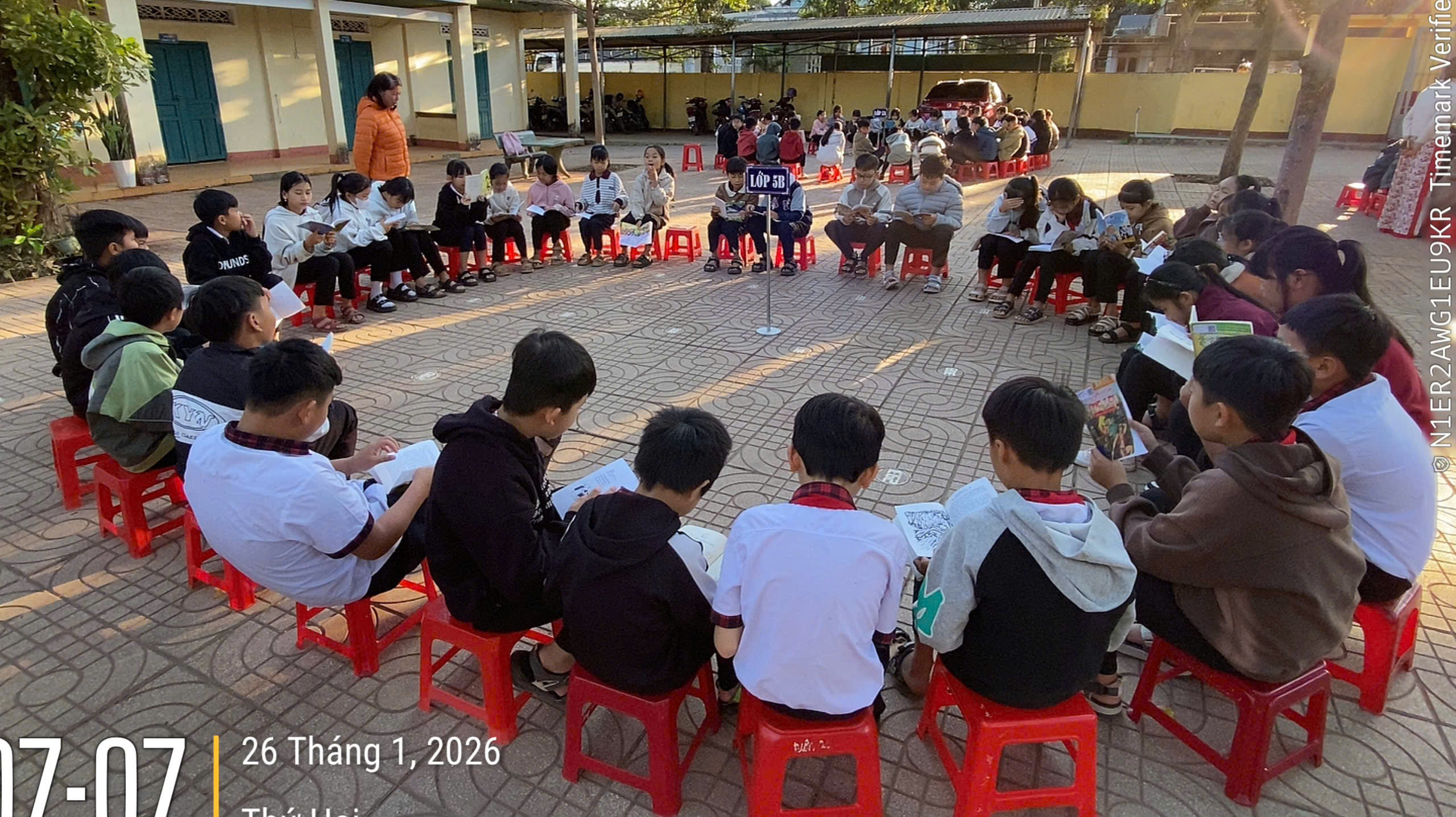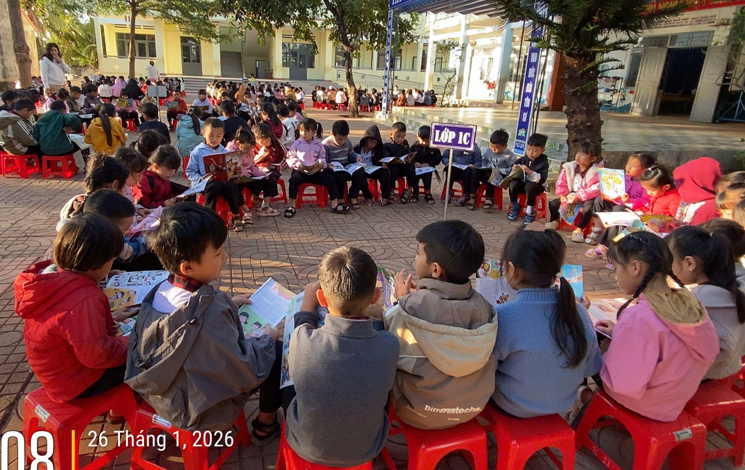 Sáng thứ Hai, ngày 21/01/2026, sân trường Tiểu học Lý Thường Kiệt bỗng trở nên rực rỡ và náo nhiệt hơn thường lệ. Thay cho những nghi thức chào cờ truyền thống, Liên đội nhà trường đã phối hợp cùng Thư viện tổ chức hoạt động “Đọc sách dưới sân trường” – một hoạt động thường niên đầy sáng tạo, mang đến luồng sinh khí mới cho các em học sinh ngay từ đầu tuần.