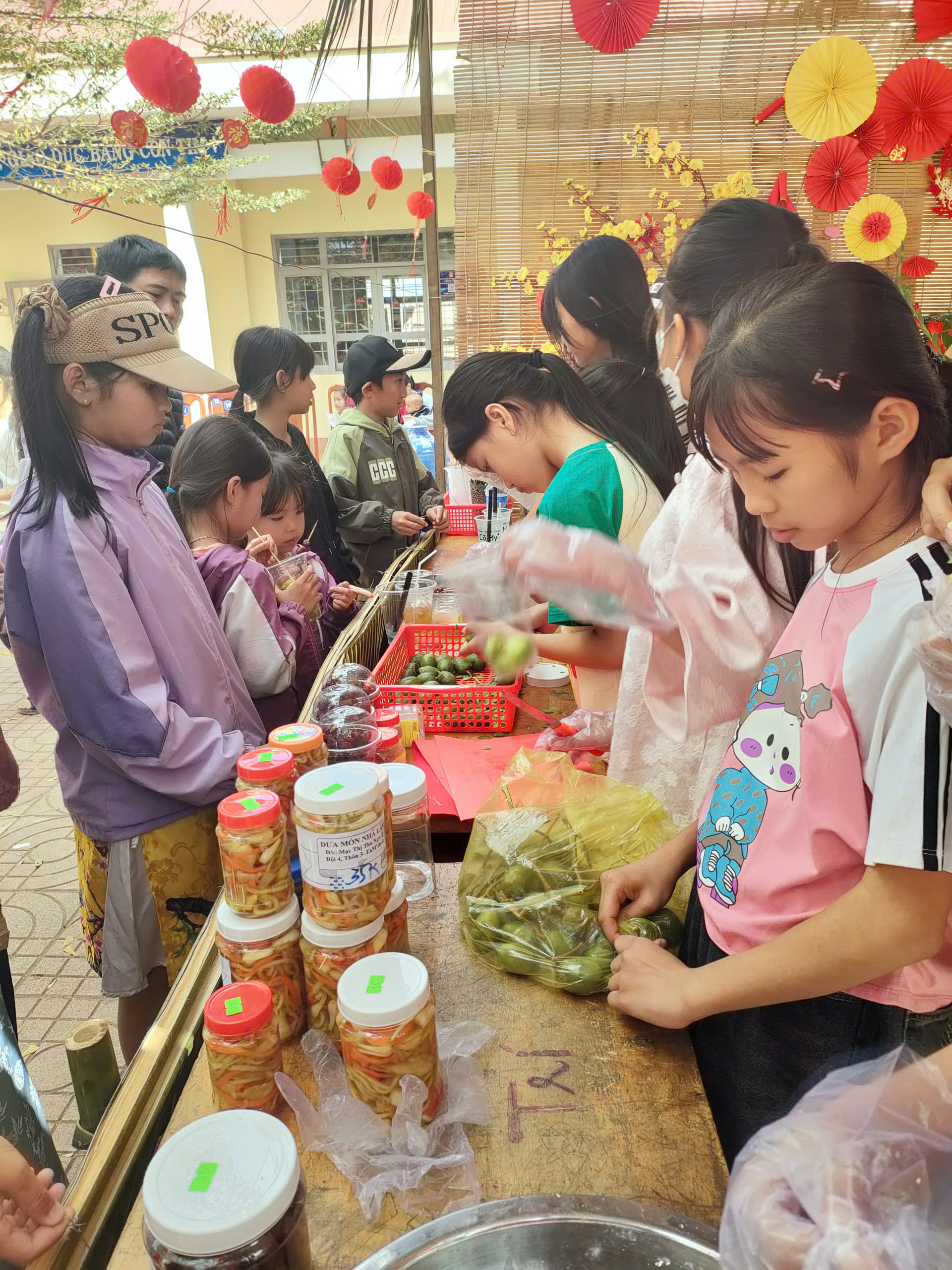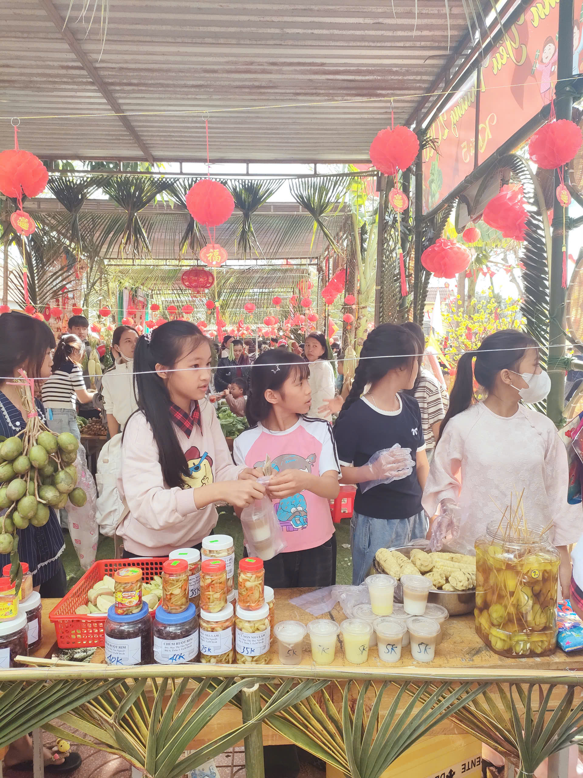 Tại hội chợ, các em học sinh không chỉ là “khách mua hàng” mà còn trực tiếp tham gia vào vai trò “người bán hàng” nhí. Các em được học cách mời chào, tính tiền, đóng gói nông sản và giao tiếp với mọi người. Những lọ dưa món, những túi bánh kẹo hay những ly nước giải khát do chính tay thầy cô và phụ huynh hỗ trợ các em chuẩn bị đã tạo nên sự gắn kết vô cùng ấm áp. Đây là cơ hội tuyệt vời để các em rèn luyện kỹ năng sống, tinh thần làm việc nhóm và ý thức về giá trị của lao động.